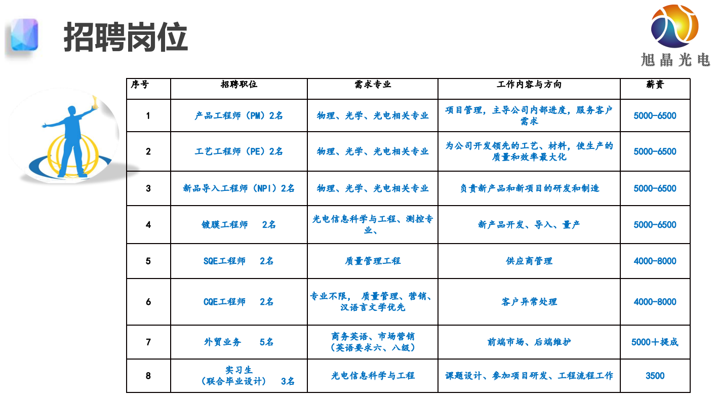 在这个充满机遇与挑战的时代,旭业光电正迈着坚定的步伐走向成功,我们深知,人才是推动公司不断前行的核心力量,旭业光电诚挚地邀请有志之士加入我们的行列,共同开启一段充满自信与成就感的职业旅程。