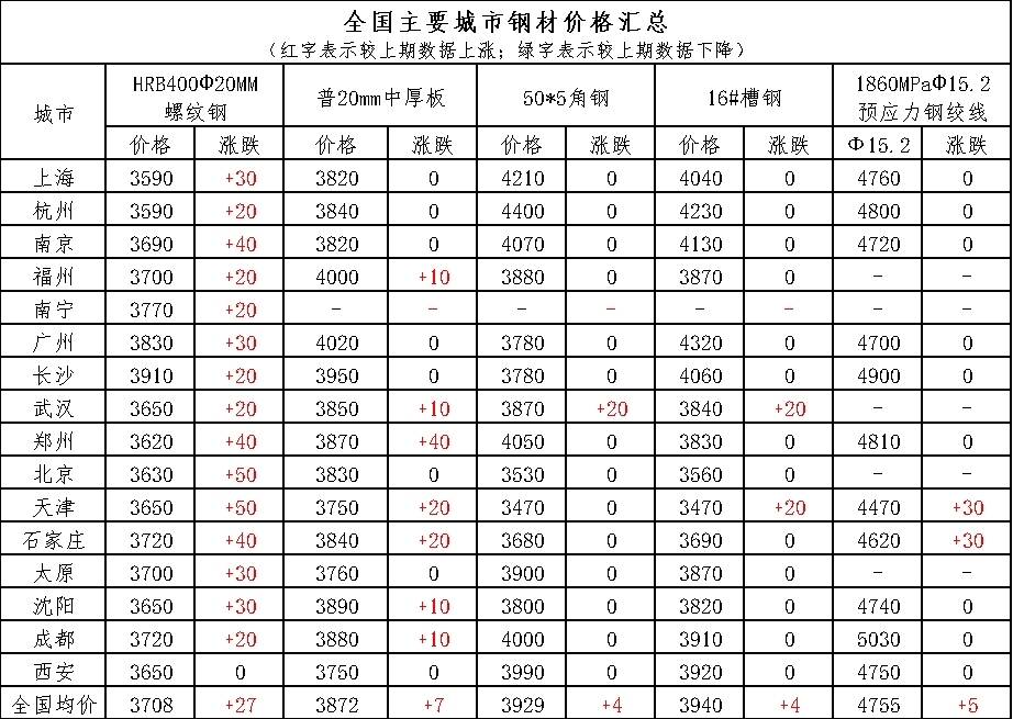 2、上海市场:上海钢筋市场价格呈现小幅上涨态势,涨幅在10-20元/吨,受原材料价格上涨影响,市场成交价有所抬高。