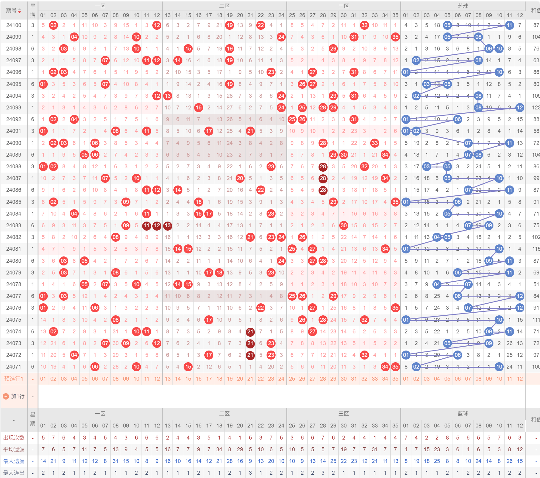 3.   遗漏值分析:计算某个号码在过去的若干期中未出现的次数,以此来推测其在未来出现的可能性。